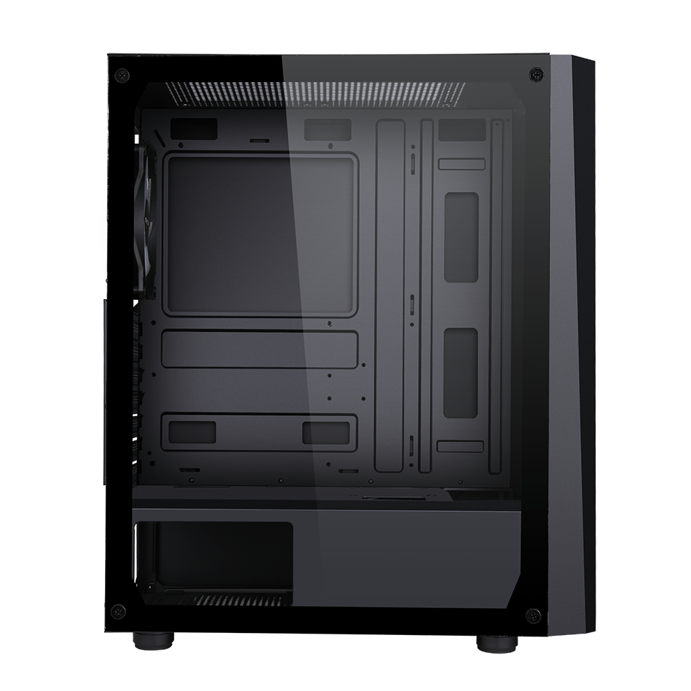 Un panel lateral completamente de vidrio templado brinda una vista clara de sus componentes internos, mientras que el panel frontal minimalista est谩 resaltado por una v铆vida tira ARGB, que brinda iluminaci贸n personalizable a la est茅tica de su equipo.